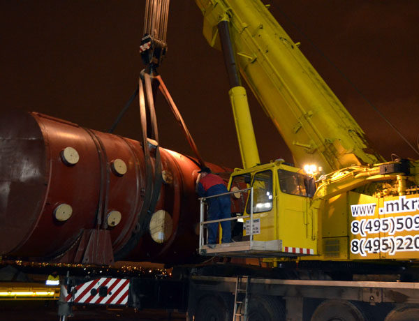 Liebherr LTM 1500 на погрузке деталей АЭС в Южном речном порту в Москве