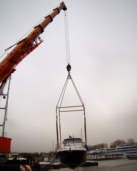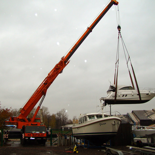 Автокран Liebherr LTM 1160 поднимает катера в яхт-клубе в Москве