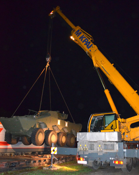 Автокран Liebherr LTM 1070 на погрузке военной техники в Кубинке