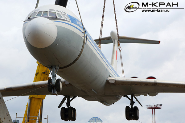 Два автомобильных крана Liebherr LTM 1350 и Liebherr LTM 1500 совместно подняли 70-тонный самолет при помощи строп, подведенных под фюзеляж. Точной и слаженной работе команды крановщиков и стропальщиков не помешал ни сильный ветер, ни большая парусность груза. С их помощью красавец Ил-62 вновь поднялся в воздух, чтобы занять свое место на 8-метровом постаменте.